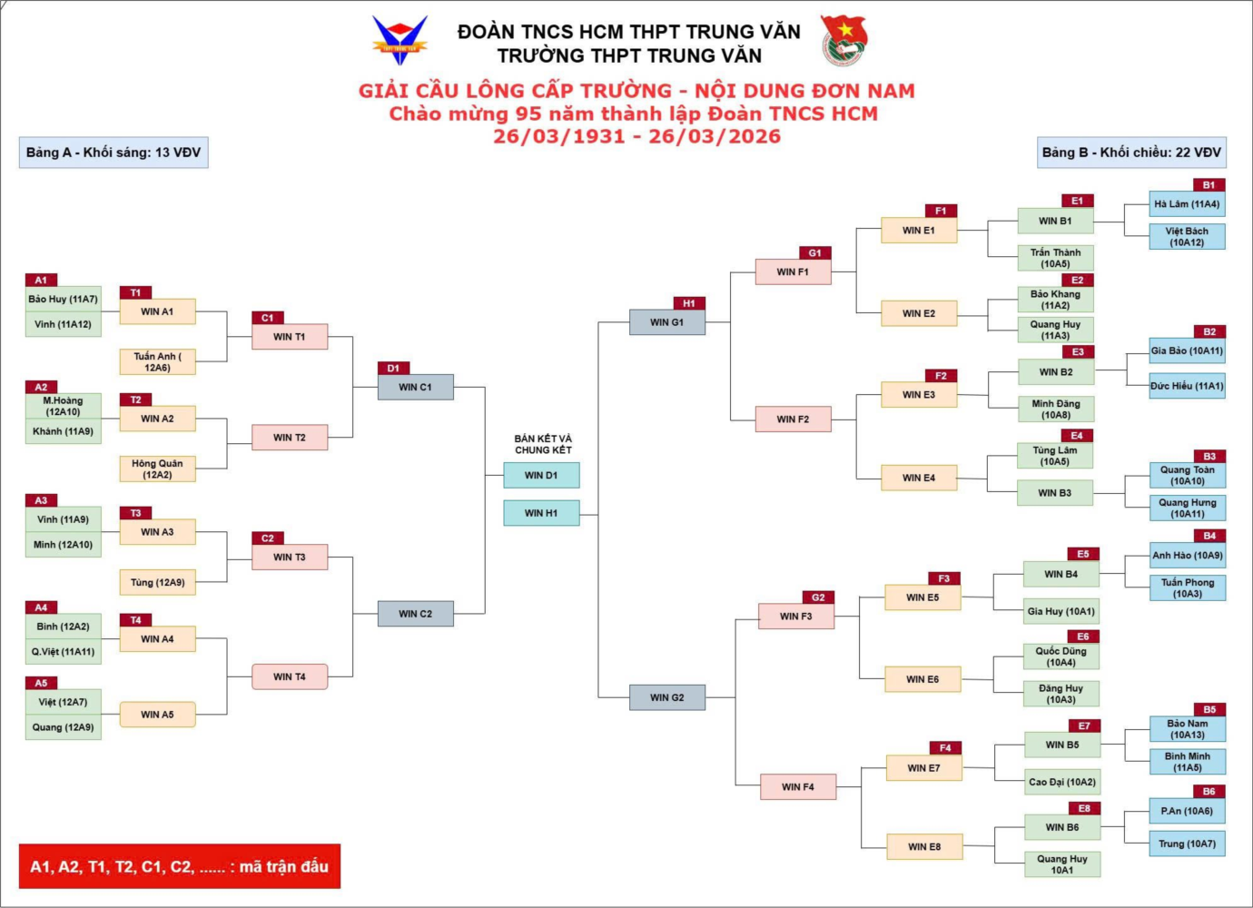 Hướng tới kỷ niệm 95 năm Ngày thành lập Đoàn Thanh niên Cộng sản Hồ Chí Minh (26/3/1931 – 26/3/2026), Đoàn trường THPT Trung Văn chính thức công bố sơ đồ thi đấu các nội dung Giải Cầu lông năm 2026.