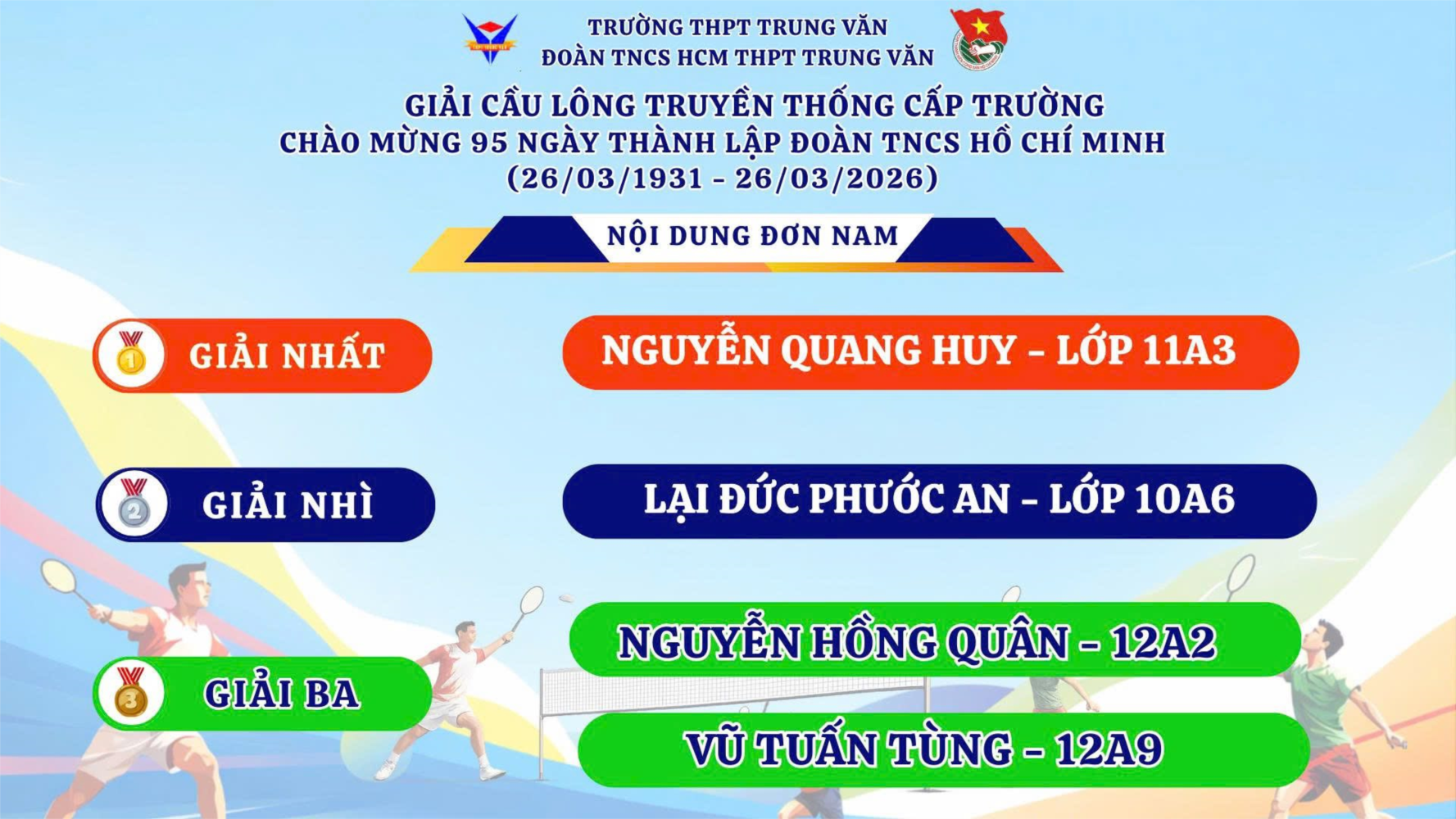Sau những trận đấu sôi nổi, hấp dẫn và đầy tinh thần thể thao, Giải Cầu lông truyền thống cấp trường THPT Trung Văn năm 2026 đã chính thức khép lại với nhiều trận chung kết kịch tính và những pha cầu đẹp mắt.