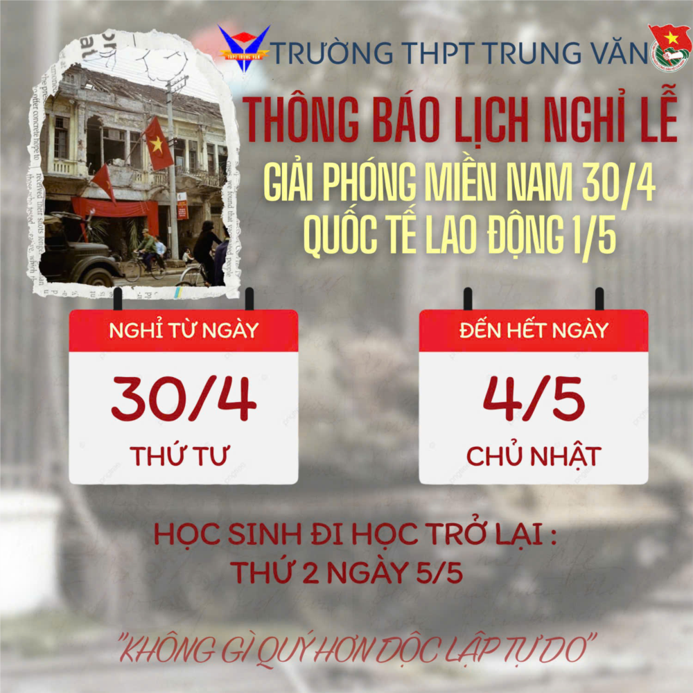 ☘️Ban Giám hiệu Trường THPT Trung Văn trân trọng thông báo đến toàn thể cán bộ, giáo viên, nhân viên, quý PHHS và học sinh về lịch nghỉ lễ Giải phóng miền Nam 30/4 và Quốc tế Lao động 1/5 năm 2025 như sau: